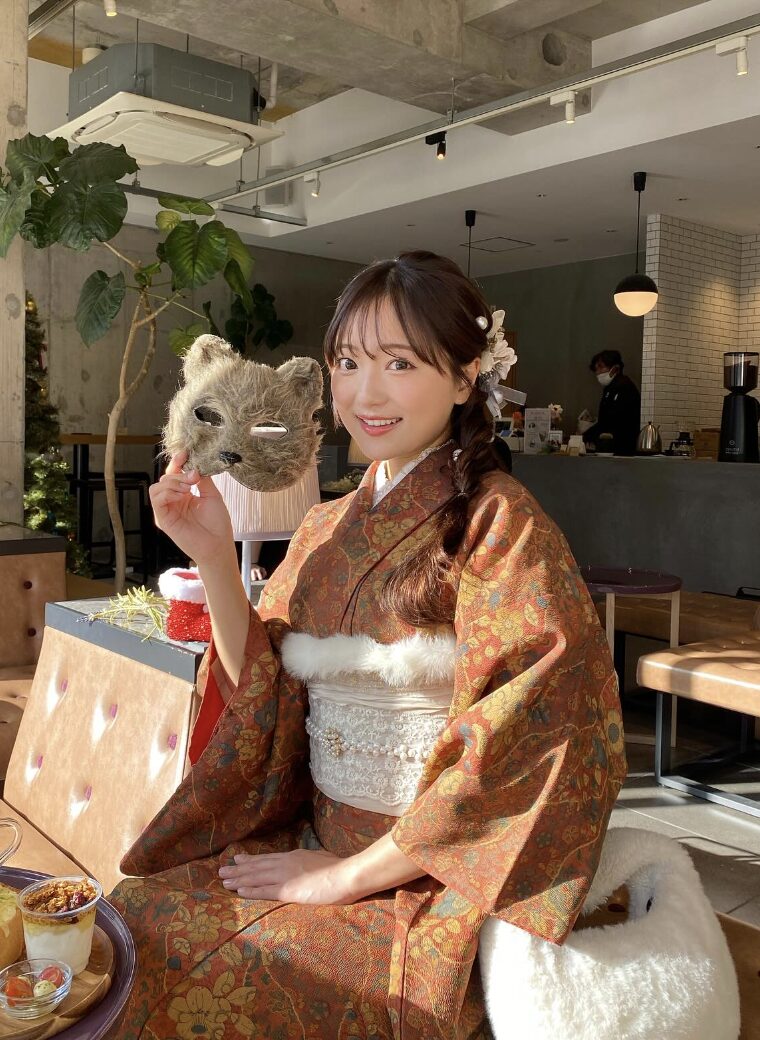 帯の部分にファー素材の小物を取り入れており、冬らしさが出ているのもポイントです。肩からかけた白いショールによって、明るい印象になっています。