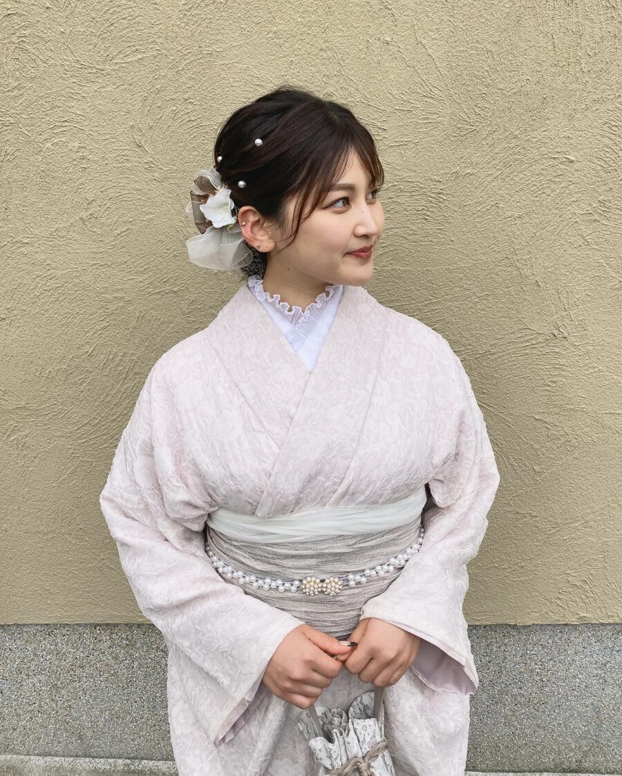 くすみピンクの色合いで品のあるシフォン素材を使った着物にレースインナーを合わせ、顔まわりの華やかさをプラスしました。