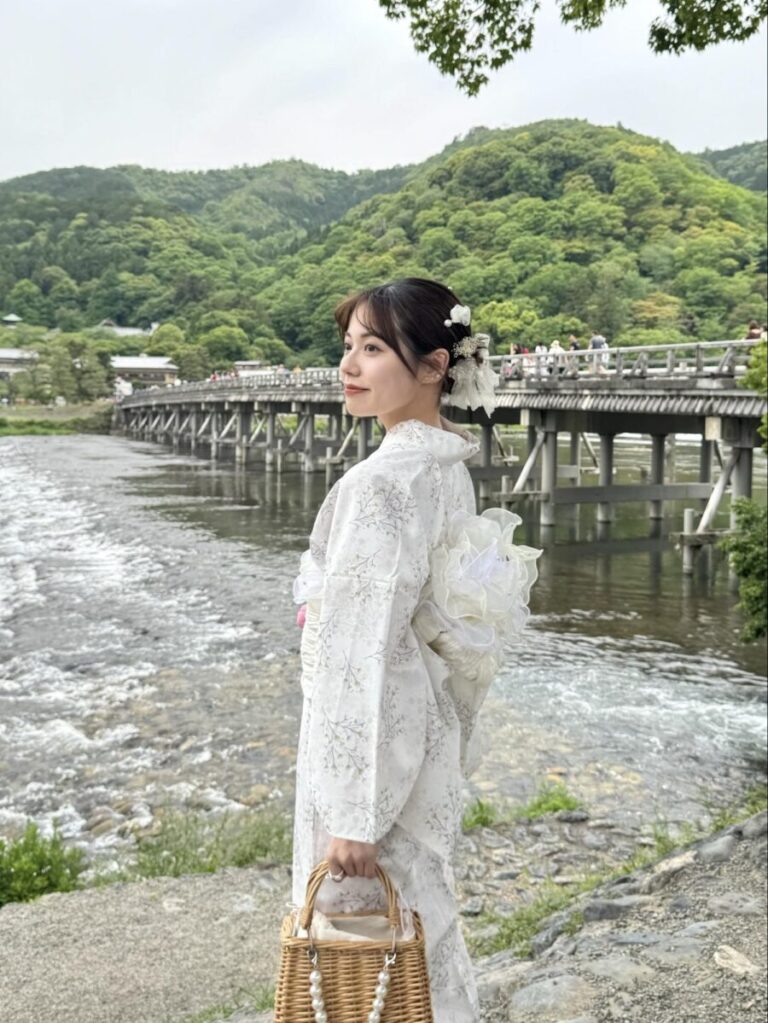 在嵐山租好和服後,首先前往從店裡步行3分鐘、嵐山的象徵——渡月橋。